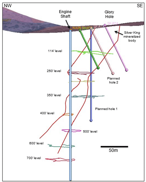 Craig Gibson, Ph.D., CPG, Chief Exploration Officer, stated: “The Silver King drill program was designed to test the upper portions of the mineralized body that hosted historic mining and to evaluate the immediately adjacent host rocks. It is encouraging that our model of the underground workings has proven largely accurate, and the upper levels of the deposit have not been as extensively mined as inferred from historic reports.”