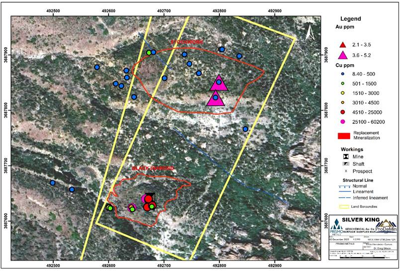 Alain Lambert, CEO of Prismo commented: ”The results announced today confirm the vast exploration potential at Silver King. While we look forward to drilling these new targets in the future, our plans remain unchanged. Our immediate priority is to undertake our fully funded drill program, as previously announced. This drill campaign will focus primarily on the historic Silver King mine site and will be for a minimum of about 1,000 meters. The objective is to test the upper half of the steeply dipping pipelike Silver King mineralized body as well as potential mineralization adjacent to the dense stockwork that was the focus of historic mining.”