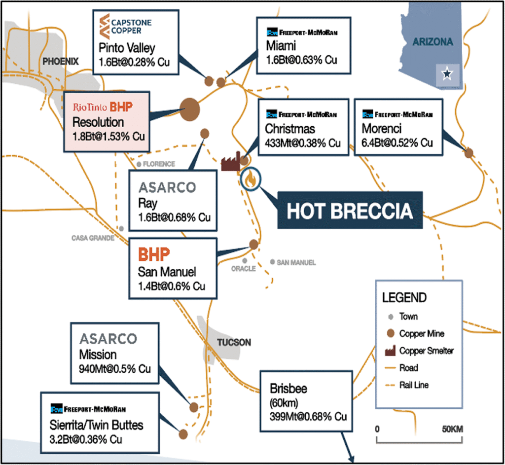 Prismo’s Hot Breccia project lies at the heart of the Arizona Copper Belt, which hosts several globally significant porphyry copper deposits.  Examples of these significant deposits are Freeport McMoRan’s Miami-Inspiration mining complex, BHP’s San Manuel mine, Rio Tinto and BHP’s Resolution deposit and others (see Figure 1).