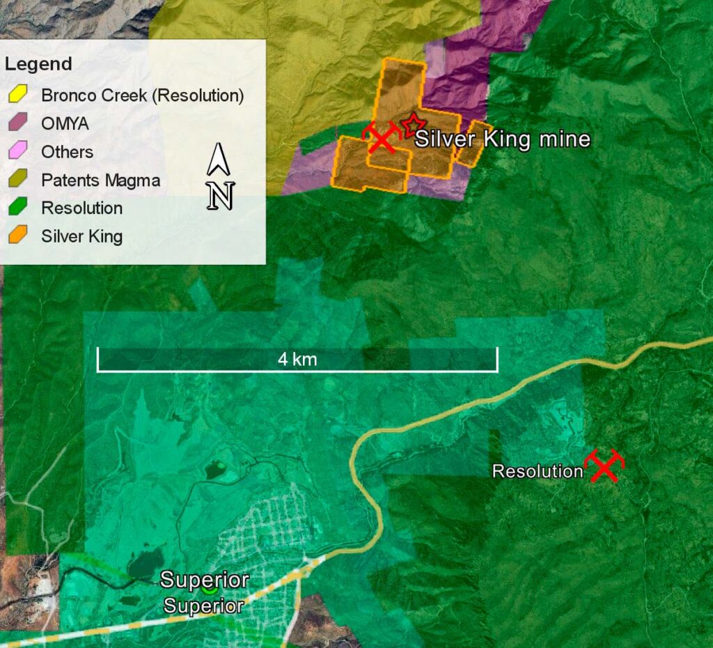 The Silver King Property is a 125-hectare project located near Superior, Arizona. It is strategically positioned only 3 km from the main shaft of the Resolution Copper project, a joint venture between BHP and Rio Tinto, recognized as the world’s largest unmined copper deposit. The Silver King land position is unique as it sits entirely within Resolution Copper’s large claim block.