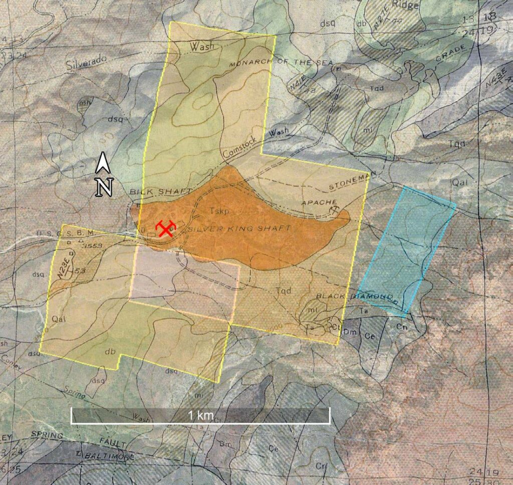 Aerial view of the Silver King mine area with approximate land boundaries. The Silver King acquisition, including the two patented claims, is shown in orange.